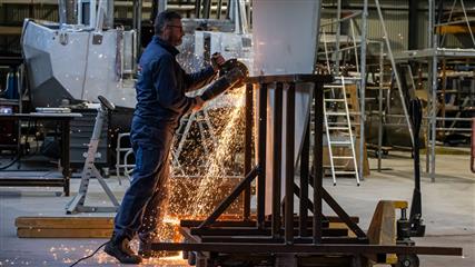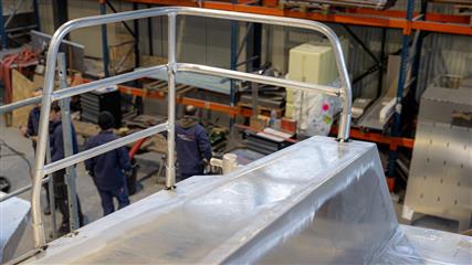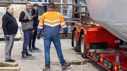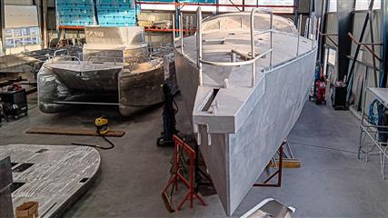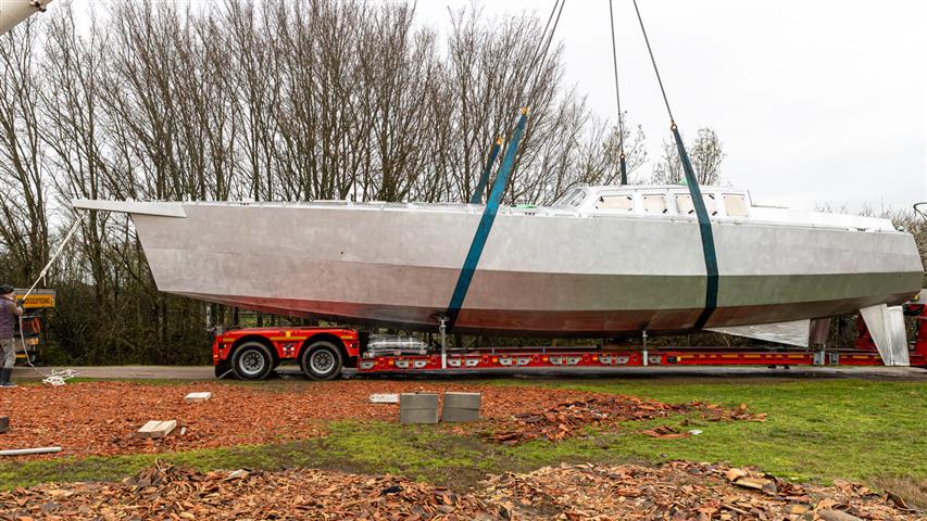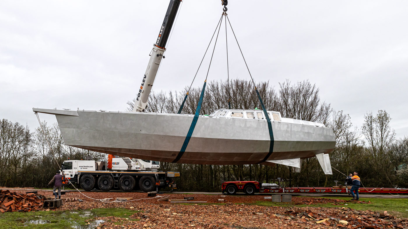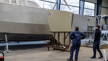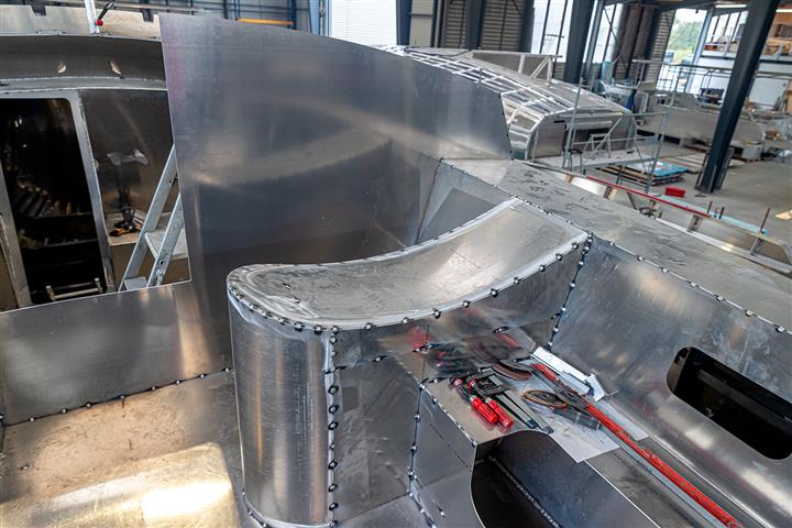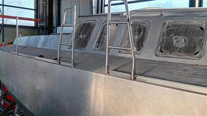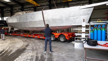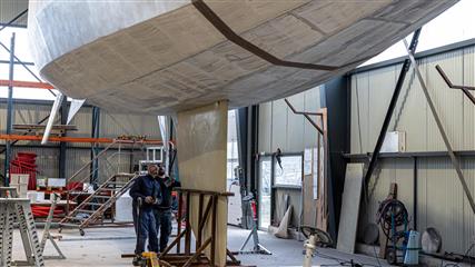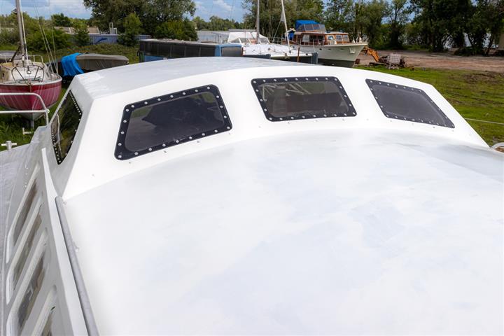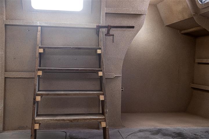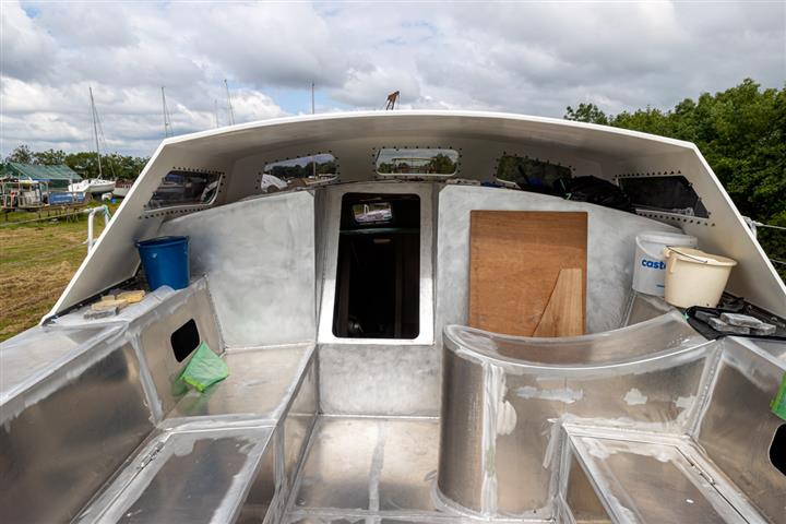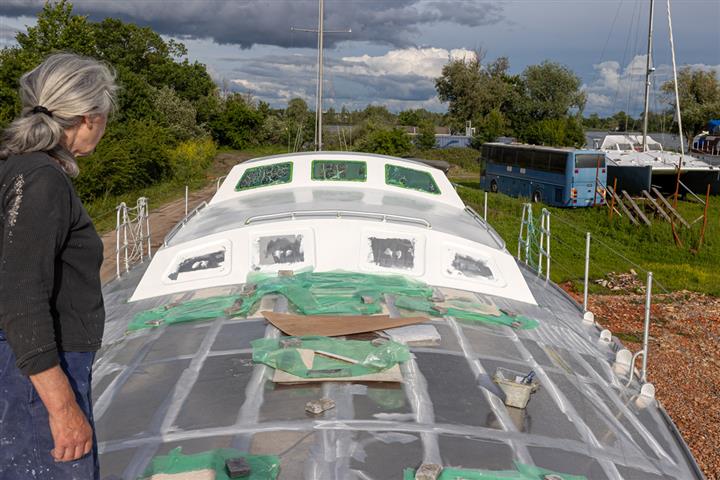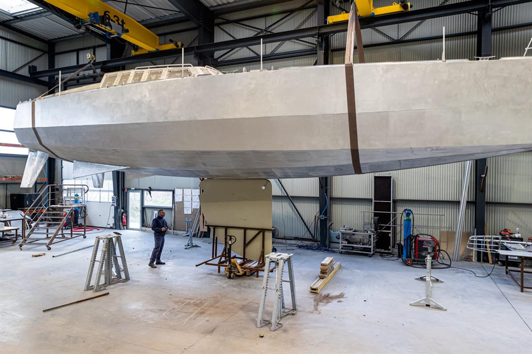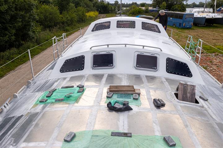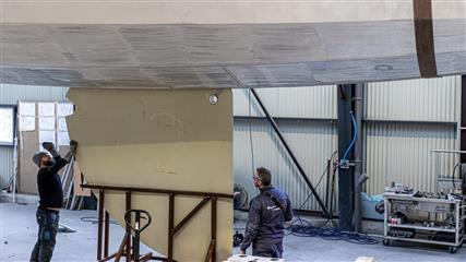 Pose du dog-house, ouverture des hublots puis pose des vitrages et panneaux de pont, descente du plomb par un tobogan depuis le pont, liège projeté à l'intérieur de la coque, peinture du pont et son antidérapant, début de la pose de l'isolant de coque, alignement des moteurs.