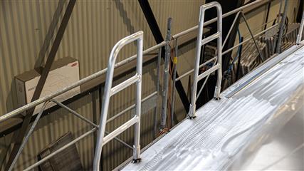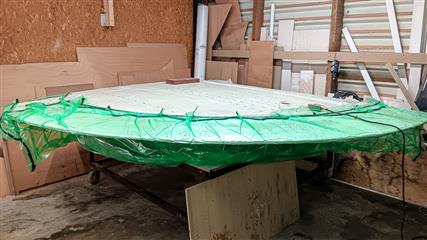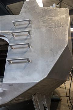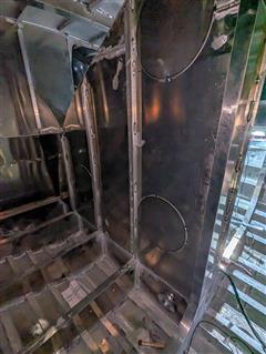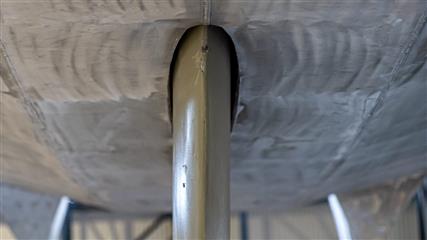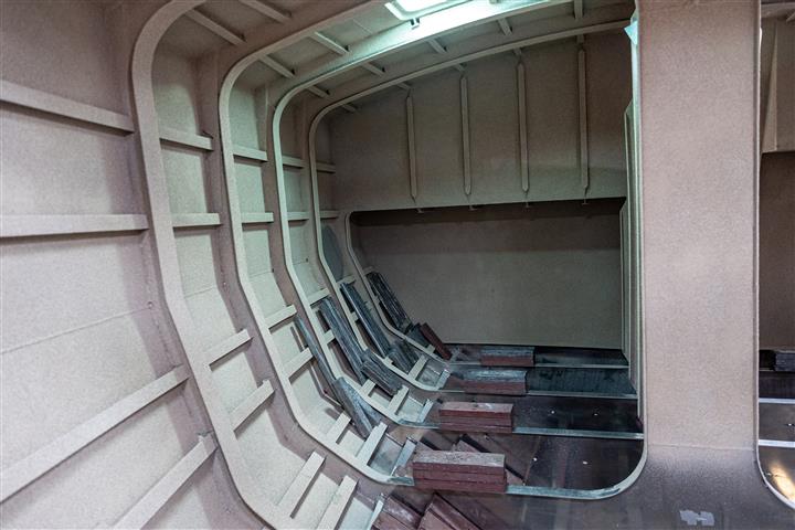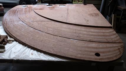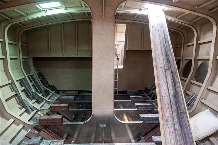 Ouverture et pose des panneaux de pont et du PMMA. A l'entrée du panneau sur bâbord l'extrémité du tobogan qui a permis de descendre les lingots de plomb à l'intérieur de la coque.
