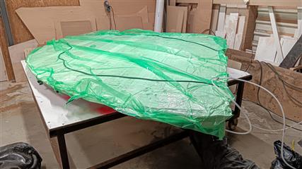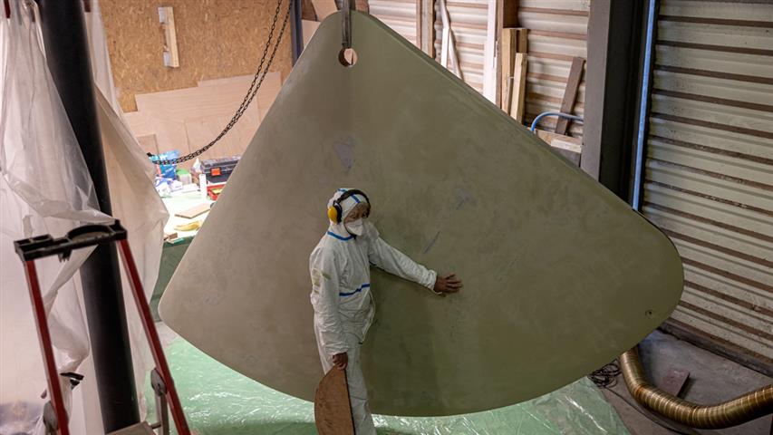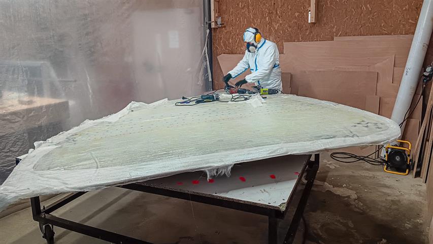 Mise en forme de la dérive puis stratification de 16 couches de tissu bibiais 450 gr et mise sous vide jusqu'à polymérisation de la résine. Ensuite passe d'un enduit, ponçage.