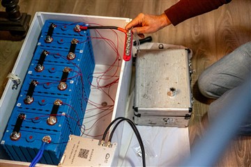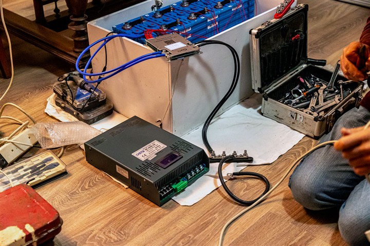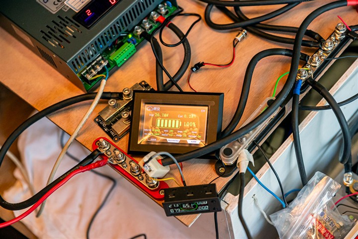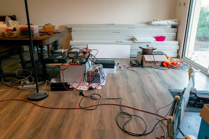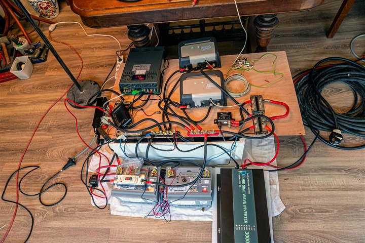 Sur les photos les divers éléments mis en situation : éléments batteries 24V lithium, BMS, chargeur batterie à batterie, alternateur, hydrogénérateur, onduleurs, plaque de cuisson, etc.
