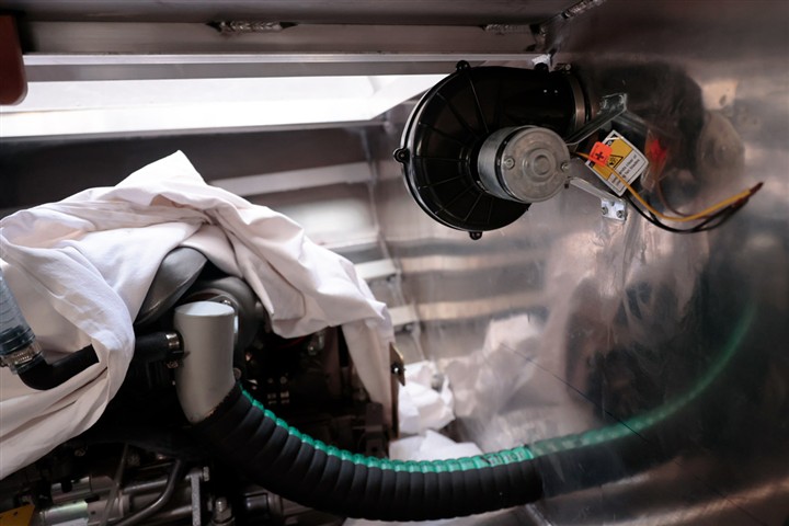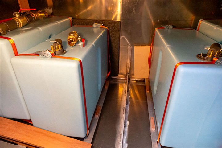 Alimentation carburant des moteurs, mise en place des réservoirs gazole. Ventilation du compartiment moteur et ligne d'échappement en place.