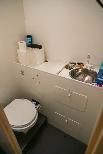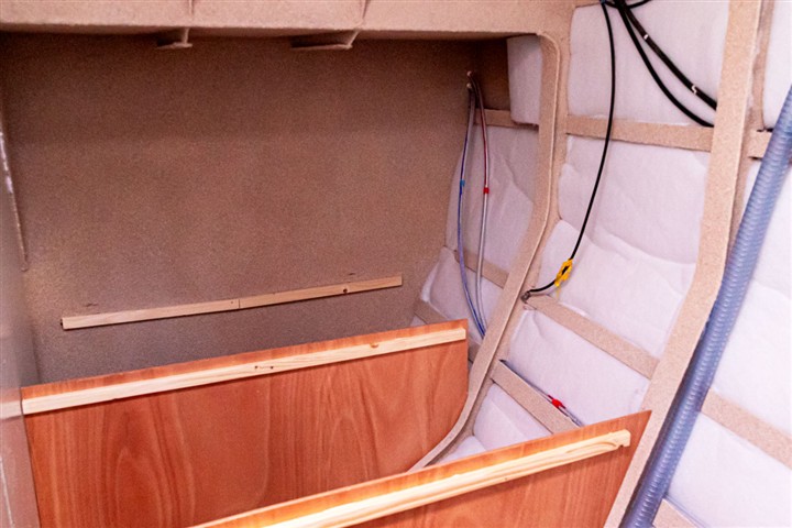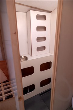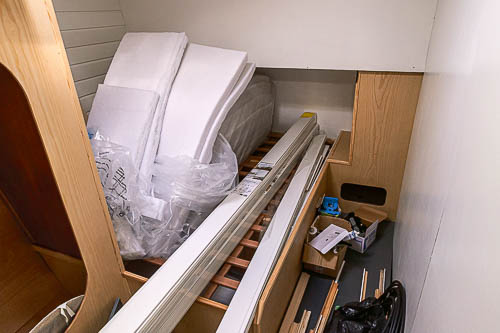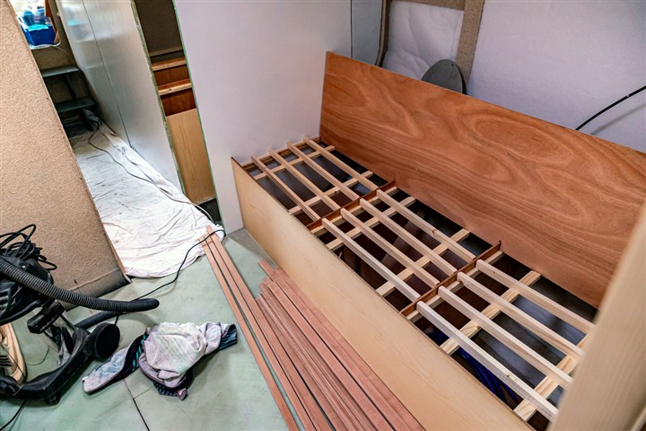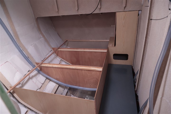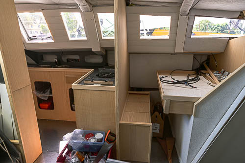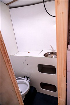 Mise en place des cloisons sandwich mousse verre époxy, des planchers en sandwich eux aussi. Aménagement du coin toilette, du coin douche, du carré avant et des couchettes