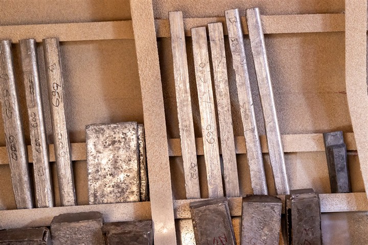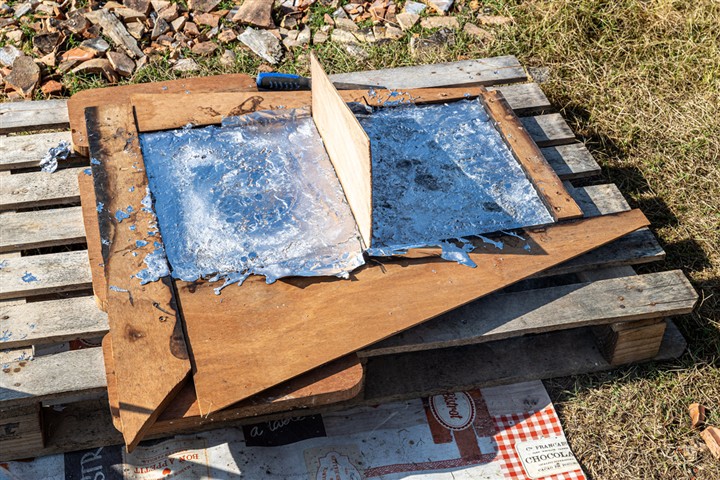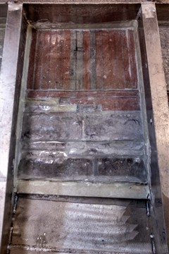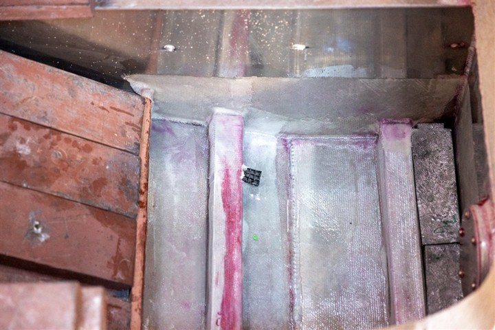 La mise en place du lest a été un peu longue car pour avoir la meilleure concentration de ce lest, dans le volume imparti, il a été necessaire de fabriquer de nombreux moules pour obtenir la bonne taille des lingots de plomb à installer dans le fond de la coque. Des lingots tout en longueur enrobés d'une enveloppe de tissu de verre résiné dans un deuxième temps à glisser sous les lisses pour éviter tout contact entre le plomb et l'aluminium de la coque. Des lingots de toutes tailles pour les adapter aux espaces à remplir, le tout pour quelques tonnes. Avant d'installer les lingots, isoler la coque avec une stratification verre résine époxy. Une fois tout ces lingots en place, les noyer et les bloquer avec de la résine de calage avant de stratifier l'ensemble à la structure. Ne pas oublier la réservation dans le lest au niveau de l'axe de la dérive pour pouvoir le retirer en cas de soucis au niveau de cette dernière.