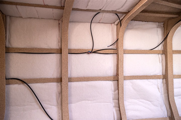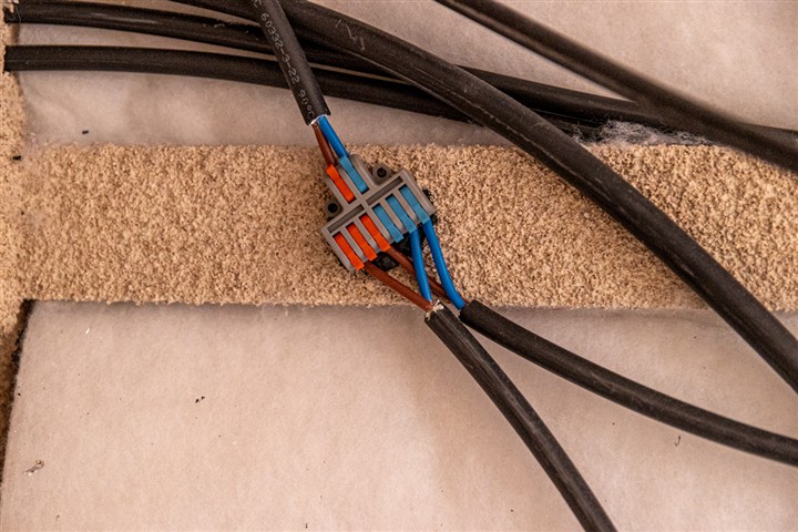 Installation des premiers câbles électriques. Câbles normes plaisance, pas besoin de les installer dans des gaines mais ils doivent être fixés tout les cinquante centimètres. Les dérivations sont collées à même la structure.