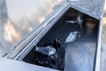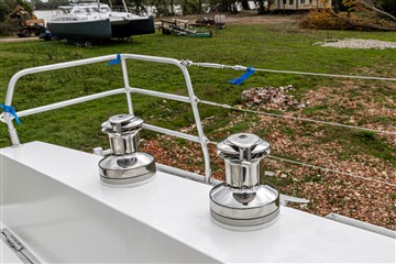 Une porte de descente à double battant en sandwich airex, cp, verre époxy. Début de la pose de l'accastillage, ici les winchs.