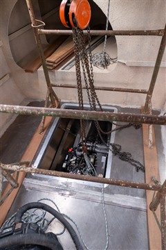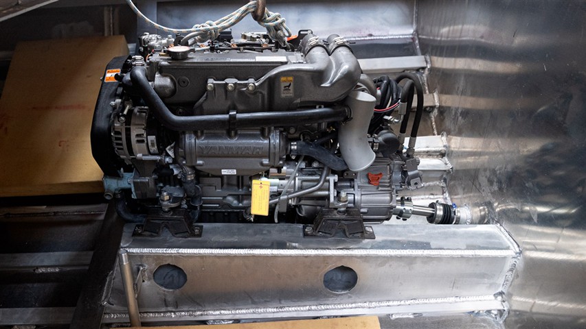 Pour aligner les moteurs deux étais de maçon et un palan se sont montrés très utiles. Moteurs et arbres d'hélice sont reliés par deux tourteaux d'accouplement que nous avons alignés avec une cale d'épaisseur de 5/100 de mm. Cela nous a pris un certain temps d'autant plus qu'avec une sortie d'inverseur à 8°, la marge de manoeuvre était réduite. Après montage nous nous sommes aperçus que la ligne d'arbre était trop longue de 90 mm ce qui produisait un porte à faux trop important en bout d'arbre compte tenu du poids des hélices. Donc tout redémonter trouver une entreprise pour raccourcir les arbres d'hélice et refaire une empreinte de clavette et recommencer la mise en place arbre d'hélice et moteur pour un alignement correct.