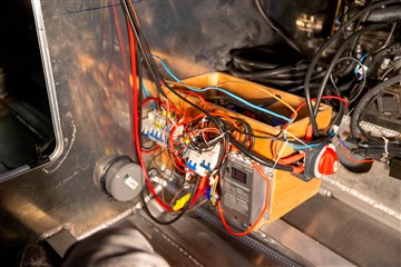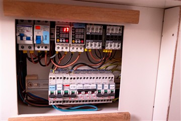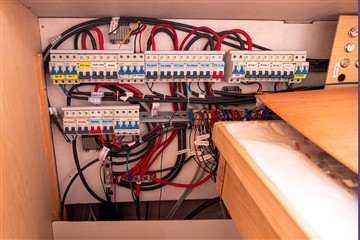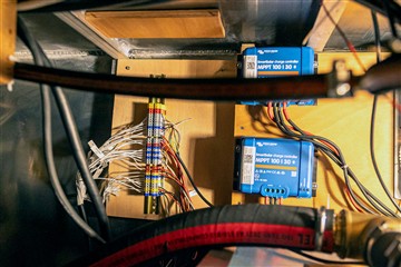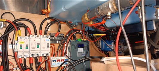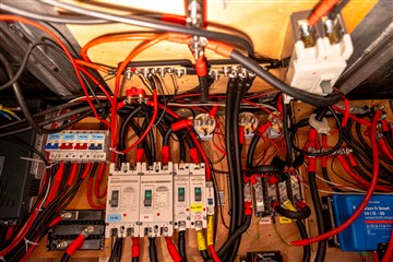 Le circuit électrique avec les MPPT pour les 4 panneaux solaires de 140 W montés en série deux par deux, onduleur de 5000kW, hydrogénérateur Watt and Sea 300W, chargeur 24V, 2 alternateurs 24V, chargeur 12-24V à partir des batteries moteur.