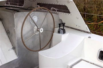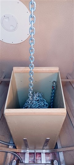 Le guindeau et la baille à mouillage. Le guindeau est un Quick Regal RG5 2300 m en 24 V. Baille à mouillage en stratifié boulonnée à la structure de la coque avec une pompe pour évacuer l'eau (mouillage et rinçage). Chaîne de 12 mm et ancre Rocna de 40 kg.