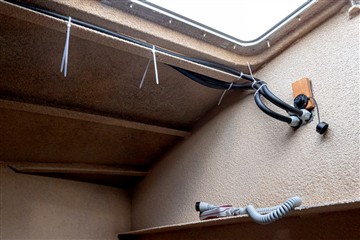 La trappe de visite du compartiment avant qui sert de crash box est étanche. Pompe de rinçage de la baille dont la sortie est couplée à l'évacuation de la pompe de cale électrique munie d'une valve anti-retour. Il y a aussi une pompe manuelle pour l'évacuation du réservoir à eaux noires, ce dernièr est muni d'une vanne trois voies pour vidange sur le pont.