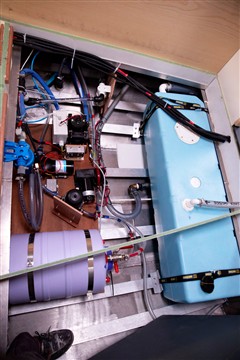 Réservoir à eaux grises et sa pompe d'évacuation. Dessalinisateur 30l/h et son réservoir dédié. Pompe du circuit d'eau. Chauffe-eau 220v et/ou circuit du chauffage à eau.