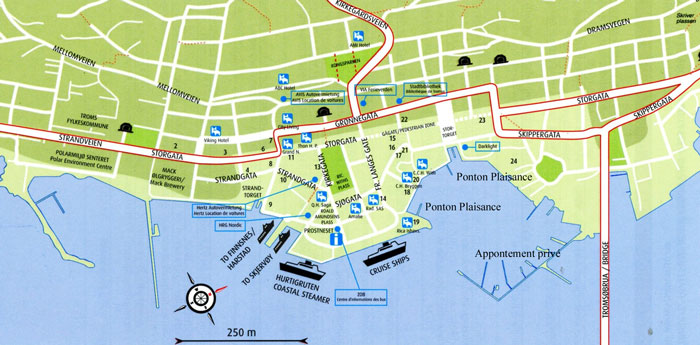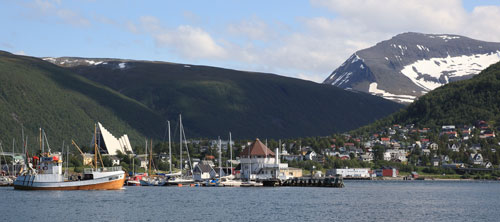 Le port de plaisance est situé juste avant le pont de Tromsø sur bâbord, dans un espace délimité à l'est par une grande digue aménagée sur des têtes de roche qui émergent, au nord par des quais en bois ou en pierre désaffectés pour le trafic maritime celui-ci se faisant maintenant en amont ou en aval où de nouveaux docks ont été construits. Deux pontons d'accueil attendent les voiliers de passages. Un à l'ouest et un second au nord. Un dizaine de places pour chacun d'entre eux. Le règlement de la location se fait par parcmètre. Les contrôleurs vérifient deux à trois fois par jour si le ticket et bien visible et si le paiement a été effectué. Gare au rappel à l'ordre.