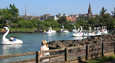 Le beau temps revenu, après cinq jours de pause, les amarres sont larguées. Route au nord vers Bangor établit sur la côte sud au seuil de la baie de Belfast. De nouveau les bords de près au débouché de la baie de Dublin. Une bruine épaisse, un voilier fantomatique et une bonne brise nous accompagneront presque tout le long du parcours. Le voilier, au gré des bords de près, disparait épisodiquement et bientôt définitivement dans la brume. Le crachin se dispersera en fin de soirée laissant enfin place au soleil. Dans une agréable lumière dorée de fin de journée de printemps, arrivée à Bangor ville balnéaire animée et très fréquentée où règnent déjà une température élevée et une ambiance décontractée de vacances, bien que ce ne soit que la fin du mois de mai. Sa marina élégante bien organisée, jouxte le port de pêche à même la ville. Un superbe Trois Mâts Suédois y est à quai en réfection. Entourée de hautes demeures victoriennes colorées dominant la mer, elle nous offrira une place pour quelques jours. Par de belles journées printanières et chaudes nous cheminons en flânant sur des sentes pédestres à flanc de coteau à la découverte de cette côte verdoyante. Sur la place centrale, animée par des équilibristes et amuseurs publics, nous faisons la queue devant le marchand de glace à proximité du petit train promenade et des pédalos en forme de cygnes, imitant en cela les estivants accablés de chaleur. Au centre-ville dans un parc, sur une superbe surface gazonnée, nous assistons au déroulement de parties de bowling sur gazon opposant plusieurs équipes dont les protagonistes sont vêtus d’une tenue d’un blanc immaculé irréprochable. Les manches, dans une ambiance « So British », se succèdent tout en retenu sans un seul geste excessif.