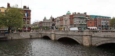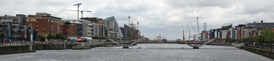 Le mauvais temps va s’installer pour plusieurs jours. Autant en profiter pour visiter Dublin situé à douze kilomètres de là. La gare, à cinquante mètres de la marina, facilite l’accessibilité au train. Les départs sont fréquents tout au long de la journée. Nous sillonnerons les rues de Dublin sous un ciel plombé, par des journées ventées parfois pluvieuses. Dublin est établi à l’embouchure de la rivière Liffey qui naît dans les monts de Wicklow au sud et s’étire sur 125 kilomètres avant de venir séparer la ville en deux : le Dublin populeux au nord et le Dublin opulent au sud. La Liffey finit de s’écouler, avant de se livrer à la mer d’Irlande, entre les quais de pierre des quartiers modernes baignés par une brise marine continue, nous rappelant que Dublin a toujours été un grand port.