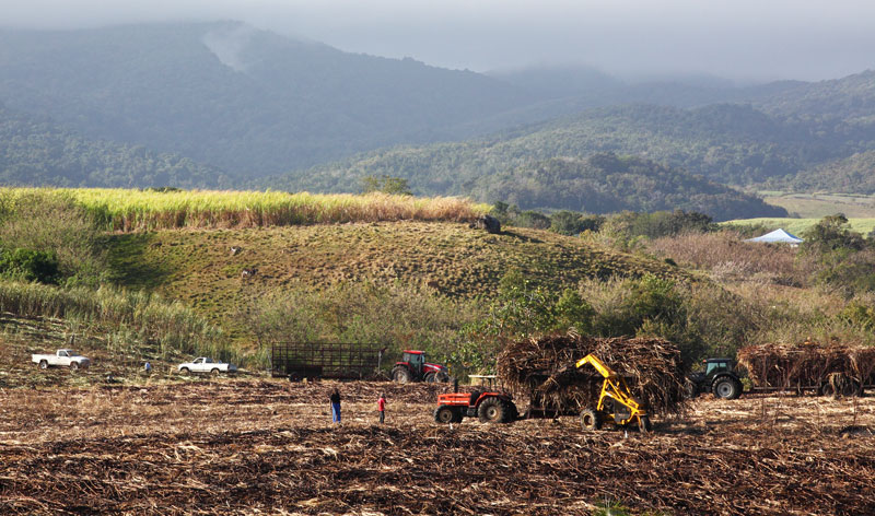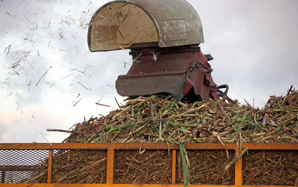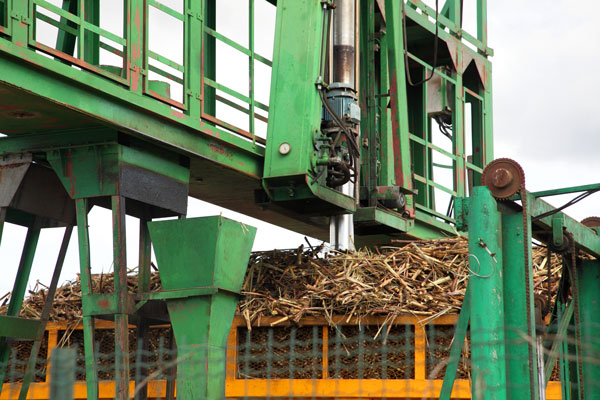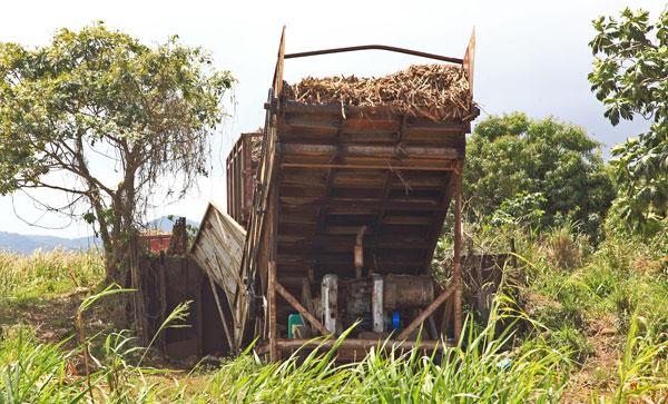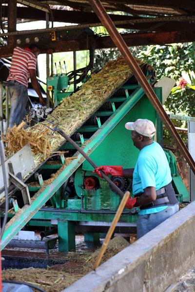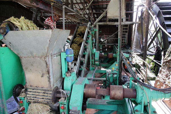 Déposés sur un convoyeur, les morceaux de canne sont entrainés dans le hache-canne où ils éclatent avant de passer dans les moulins de broyage. Cette manoeuvre favorise l'extraction du jus.