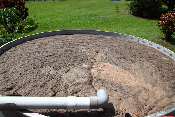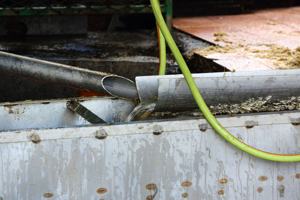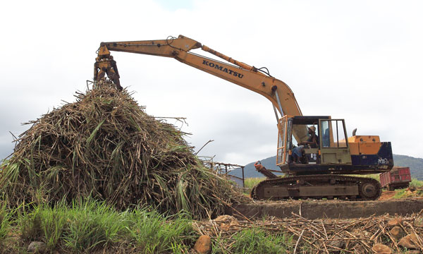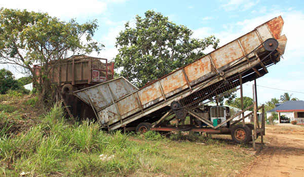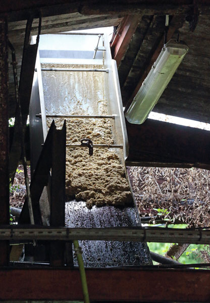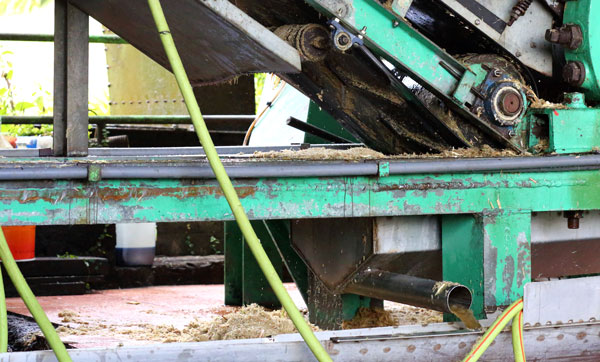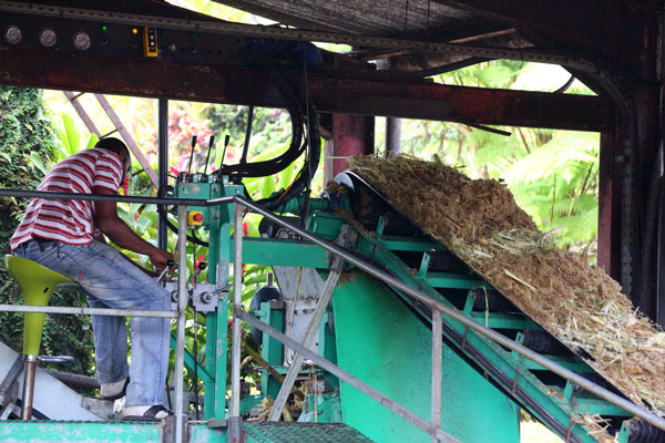 La bagasse (fibres qui restent après extraction du jus) est stockée dans le "trou à bagasse" où elle est mise à disposition des agriculteurs comme litière pour les animaux ou engrais fertilisant pour les champs.
