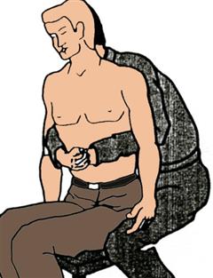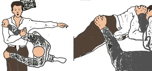 · La victime peut se tenir debout : l’opérateur se place derrière la victime, passe les bras en ceinture au niveau de l’abdomen sous les bras de la victime, un poing au creux de l’estomac, la deuxième main sur la première, les avants bras appuyés sur les dernières côtes du sujet. On enfonce brusquement en associant un mouvement des mains et des avant-bras de bas en haut.