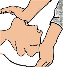 · Maintenir la tête fléchie en arrière en continuant à appuyer sur le front avec douceur. La main sous la nuque glisse vers le menton pour ouvrir la bouche.