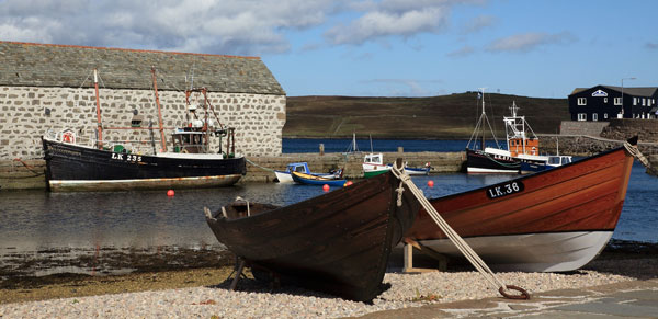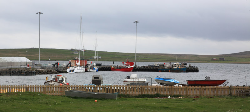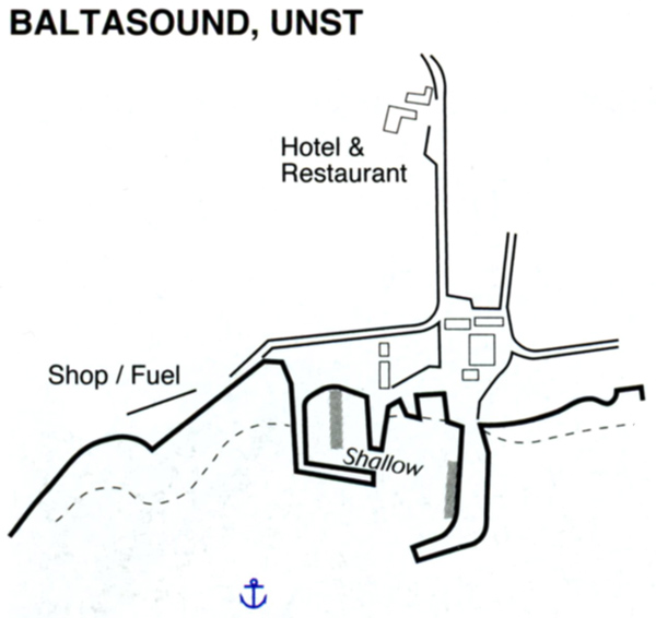 Unst est la plus nord des îles Britanniques. Baltasound, la ville principale (!) sur la côte est, située dans une baie profonde dont l’entrée est protégée par la petite île Balta qui délimite deux passages pour l’accès à cette baie: un nord et un sud. Le port avec une petite marina se trouve sur la côte nord de la baie. On y accède par un chenal bien balisé par la passe sud qui laisse à bâbord et à tribord des fermes marines. La marina ne peut accueillir que de petites embarcations. Un ponton est installé sur le bord ouest de la jetée et accepte des bateaux jusqu’à une taille d’une quinzaine de mètres. Attention il n’y a qu’une place. Si elle est occupée on peut se mettre à couple au bateau déjà à poste ou à un bateau de pêche sinon aller mouiller au sud ouest du môle dans des fonds de sable de bonne tenue. A peine amarré le "harbour master", plus britannique que nature (costume sombre strict et cravate club, sourire chevalin) surgit avec sa voiture, descend de celle-ci, s'empresse de nous souhaiter la bienvenue, nous fait l’article de tous les attraits de son île et fournit une documentation rédigée par lui-même précise-t-il. Il doit avoir peur que le touriste s'évapore. En effet il y a peu de voiliers de passage (britanniques ou étrangers) dans ce port le plus haut en latitude des Îles Britaniques. Devant Noème un voilier battant pavillon Australien est à couple d'un pêcheur. Il y a affluence en ce début de mois de juin.