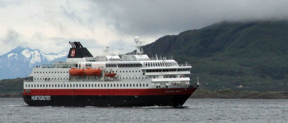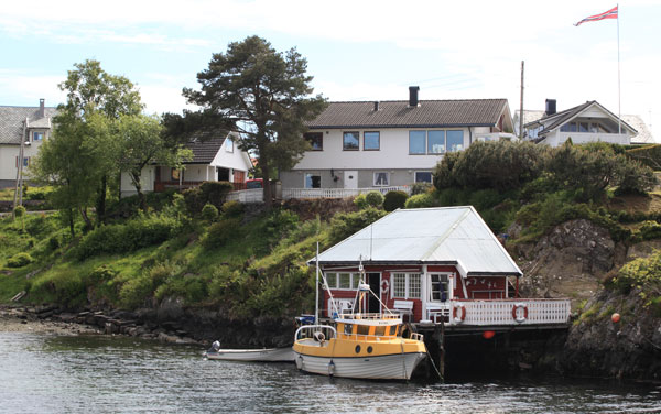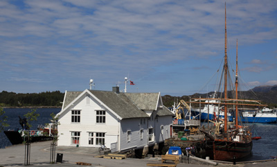 Strandgata la rue principale de Florø, bordée d’édifices colorés en bois, principalement du dix-neuvième siècle, est charmante à parcourir sous le soleil. Elle longe la baie qui n’est qu’un long quai où viennent s’amarrer bateaux modernes de travail et de services côtoyant quelques rares bâtiments de travail à voile traditionnels. Tout à la fin du quai une place est réservée à l’Hurtigruten le légendaire express côtier qui fait la route de Bergen vers le nord de la Norvège plusieurs fois par semaine. Les bateaux de la compagnie transportent passagers et marchandises tout au long de la côte norvégienne. Claude Villers raconte dans son livre "Au nord du monde" son périple norvégien à bord du Vesteralen de l'Hurtigruten.