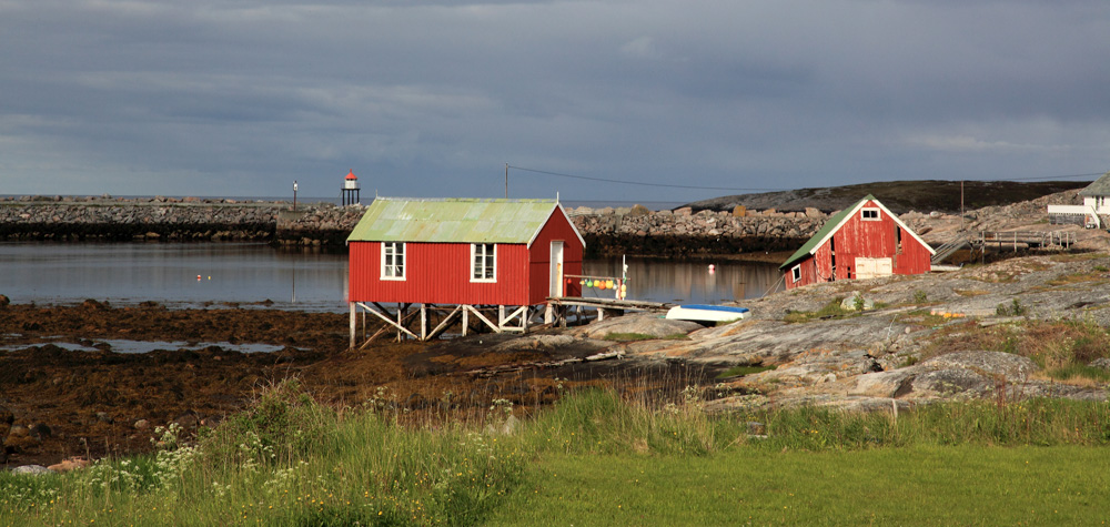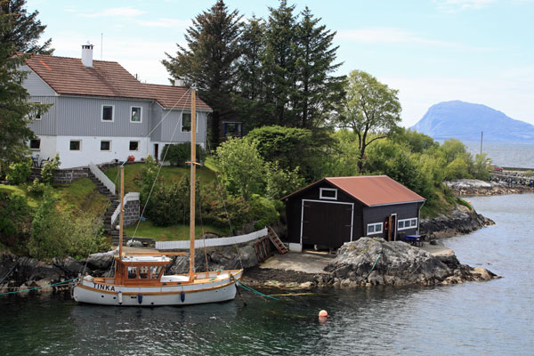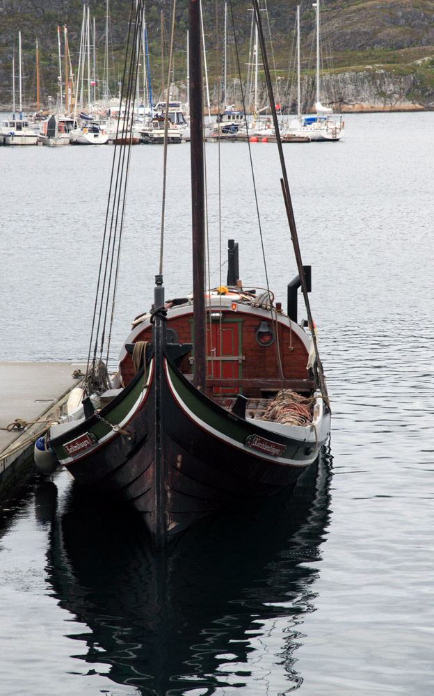 L’escale aurait pu se prolonger mais il faut continuer, le but du voyage n’est pas encore atteint, la route encore longue. Le mouillage est quitté à regret sous la pluie. Encore de la pluie et du vent. Cette année décidément la météo est exécrable. A la fin de la journée, la navigation sera récompensée par une halte dans un petit port tout à fait remarquable : Sᴂtervågen. L’entrée en forme d’esse, entre une jetée à tribord et de grosses roches à bâbord, est étriquée et ne permet pas à deux bateaux de se croiser. Deux morutiers sont à quai. Un vrai ponton est installé au pied d’un hôtel-bar-restaurant tout de rouge peint. Surprise un voilier Néerlandais y est déjà amarré, c’est le premier voilier que nous croisons depuis Florø, mais l'équipage est absent. Dans le port peu profond émergent des têtes de roches encombrées de mouettes et de goélands. Ces écueils laissent peu de place pour les manœuvres. Un coup de chance le vent ce soir est modéré et aide à la manoeuvre d’accostage en poussant Noème par le flanc sur le ponton. Tout se passe bien, heureusement car le ponton est court et une vedette d'une dizaine de mètres en occupe une extrémité alors que le voilier Néerlandais est amarré du côté opposé. Sᴂtervågen anse naturelle simplement fermée par une digue qui ainsi assure la protection de nombreux petits bateaux amarrés à des coffres. Des maisons de pêcheurs colorées éparpillées au voisinage du port et une épicerie-bureau de poste constituent ce petit bourg d'une centaine d'habitants. Comme toujours dans ce pays si peu peuplé, aucun habitant sur les chemins et dans les rues. Le lendemain matin un dernier tour à pied de ce charmant village, sous un soleil ressuscité, avant de le quitter par une jolie brise traversière pour aller sur Rorvik, petite ville assoupie, plus au nord dont la particularité est d’avoir un musée à l’architecture ultramoderne et audacieuse. Ce musée retrace la vie côtière des populations locales au cours du temps, leurs méthodes de pêches séculaires et modernes ainsi que les techniques de construction navale de la préhistoire à nos jours.