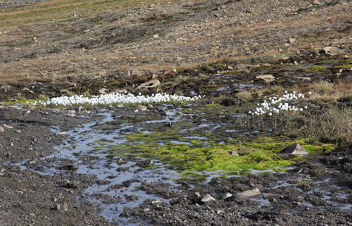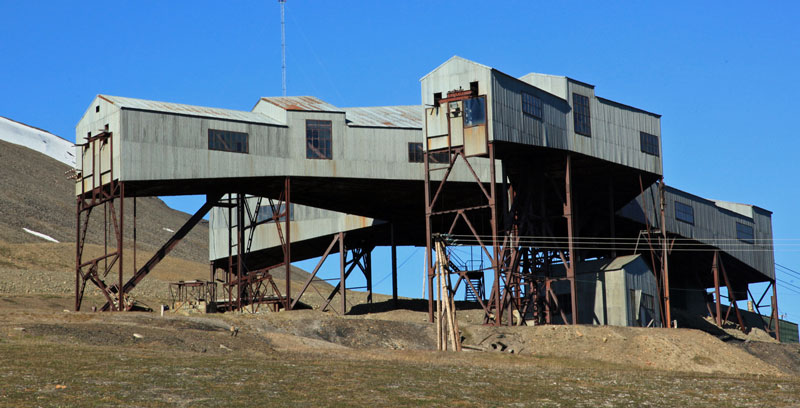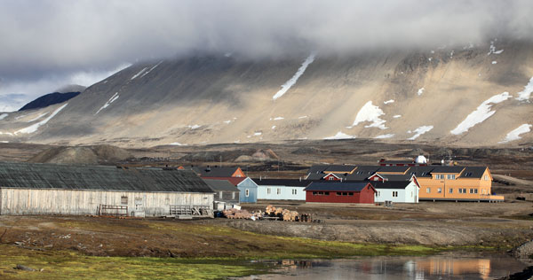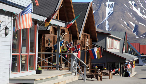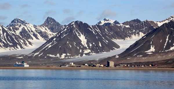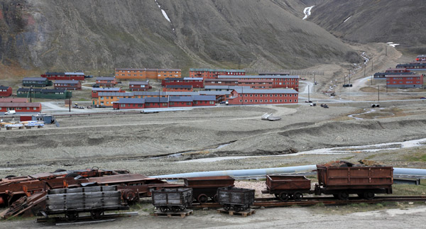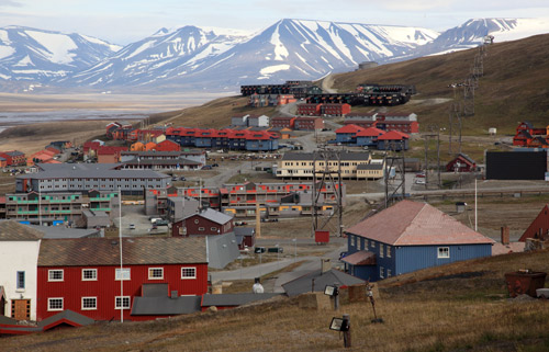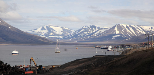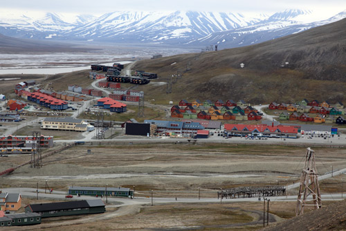 Depuis le port, Longyearbyen, la seule vraie ville de l’archipel avec ses 1500 habitants, se détache dans un site grandiose marquée des flétrissures des mines de charbon maintenant à l’abandon. On accède au centre administratif en montant le long d’une route goudronnée dans un paysage lugubre, imposant et désertique. En de rares lieux lichens et brins d’herbe poussent. Par-ci par-là, au milieu de la rocaille, de tout aussi rares fleurs en bouquet émergent et se dépêchent de profiter du court été. En contrebas de la route l'agglomération apparait d'une précarité définitive malgré les nombreux édifices modernes en construction et plus particulièrement des hôtels. Constructions liées au développement du tourisme depuis la fermeture des mines de charbon. Devant les maisons stationnent, inactifs skis, motoneiges et volumineuses pelles. Au « Palais du Gouverneur », en bois peint gris anthracite, la porte d’entrée s’ouvre sur un grand sas aux murs recouverts d’étagères garnies de chaussures en plastiques. Ces chaussures sont mises à la disposition des visiteurs. Ici avant d’entrer dans un bâtiment on ôte ses souliers pour ne pas maculer le sol de traces. Cette habitude remonte à l’époque de l’exploitation charbonnière, période durant laquelle la poussière de charbon, extrêmement salissante, envahissait tout. Une secrétaire nous fait attendre puis au bout d’un long moment nous sommes reçus par la responsable du service qui s’occupe des voyageurs individuels. Les formalités ne durent que 5 minutes, notre dossier est complet. Nous sommes libres de circuler et naviguer au Spitzberg. Nous récupérons nos croquenots et partons à la découverte de la ville.