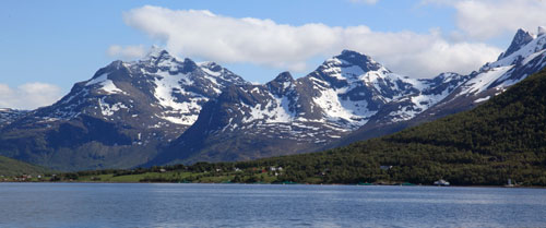 Toujours plus nord, Lodingen le 23 juin au soir. Premier port au sud des Vesteralen au fond de Vestfjord, à l’entrée du Tjeldsund, construit dans une petite baie ouverte au sud-est, deux pontons dévolus aux voiliers de passage dans un beau cadre montagneux. Peu de service si ce n’est dans la rue principale une épicerie et le long des quais des conserveries de poissons.