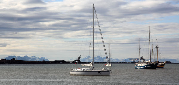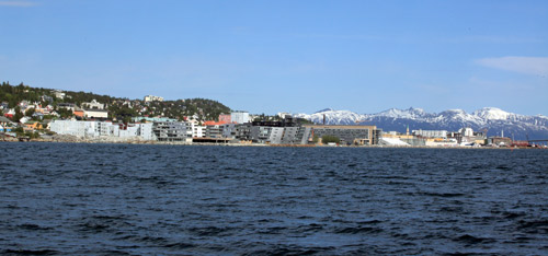 A 23h30 le 24 juin après une journée sans vent mais ensoleillée, mouillage dans la petite baie de Kårvika occupée en partie par une énorme usine de transformation de poisson associée à un fumet typique. Comme il est tard et bien que Tromsø ne soit plus qu’à 25 milles, l’ancre est mouillée. Le vent en fin de soirée tournera suffisamment pour diriger les odeurs vers d’autres rivages. Le lendemain Noème est au ponton de la marina de la « Paris du nord » par 69°40’ nord à midi trente. Ici c’est la dernière escale avant la traversée pour le Spitzberg.