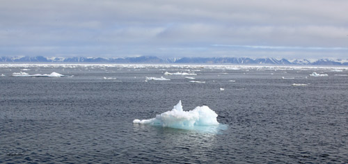 Après quelques heures de sommeil toujours aussi difficile à trouver malgré une obturation des hublots de la cabine afin de limiter la lumière solaire permanente, c’est l’approche du glacier Pyramiden à toute petite vitesse au moteur car le vent et toujours absent. A faible allure les growlers frappent la coque qui résonne à chaque impact mais ne l’abîme pas. Ces morceaux de glace ne présentent pas une masse apparente énorme mais le hic est que seulement deux dixième du total du volume du glaçon émerge le reste est sous l’eau. Le poids global fait rapidement une à plusieurs tonnes selon les blocs de glace. Il est préférable de les pousser de l’étrave pour les écarter plutôt que les percuter violemment.