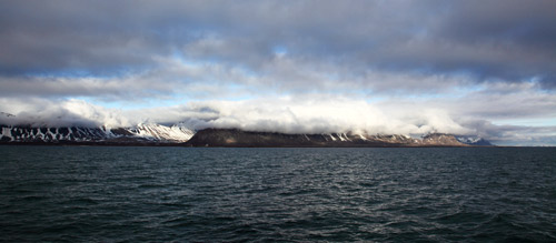 Le 10 juillet au matin visite de Longyearbyen par un beau temps frais et ensoleillé. A 17h30 le mouillage est relevé, en route pour le nord du Svalbard. La route consiste à quitter Isfjorden en longeant la côte nord du fjord et passer à proximité d’un ensemble de trois glaciers qui se jettent dans la mer. A la sortie d’Isfjorden la route remonte au Nord-nord-ouest et s’engage dans Forlandsund, un passage protégé entre l’île principale Spitzbergen et l’île Prins Karl une île tout en longueur (45 milles de long pour 5 milles de large). Une large plaine basse de 10 milles en son centre sépare deux massifs montagneux, l’un au nord avec des glaciers et un second au sud. De loin ce relief fait croire à l’existence de deux îles indépendantes. Le ciel se couvre, la température fraîchit, un crachin maussade enveloppe le paysage au point de réduire la visibilité à un quart de milles. Le mouillage prévu à Farmhamna, une petite baie ouverte au nord dans l’est de Forlandsund, est touché à deux heures du matin. La bruine est si intense que le meilleur emplacement est difficile à trouver, des écueils et des hauts-fonds tapissent la baie dans son sud mais le plan d’eau reste calme. Il fait froid et il vente. Noème maintenu bout au vent l’ancre descend et la chaîne se dévide. Noème cul, cul encore. L’ancre ne croche pas. Le mouillage est remonté difficilement, l’ancre au sortir de l’eau est noyée dans un amas d’algues géantes marrons et gluantes. Ces algues tapissent le fond, l’ancre ne parvient pas à s’enfouir. La troisième tentative est la bonne. Ouf, heureux de se mettre à l’abri et profiter de la chaleur dégagée par le chauffage à air pulsé. Brrr ! Quel temps ! Dans la journée il n’y aura aucune amélioration. Le rivage de temps à autre est entre-aperçu dans une déchirure de la bruine. Lecture, crêpes et gâteau au chocolat seront au menu du jour. L’équipage n’a aucune envie d’aller se faire rincer, il préfère attendre une embellie.