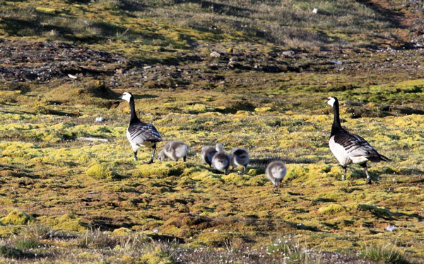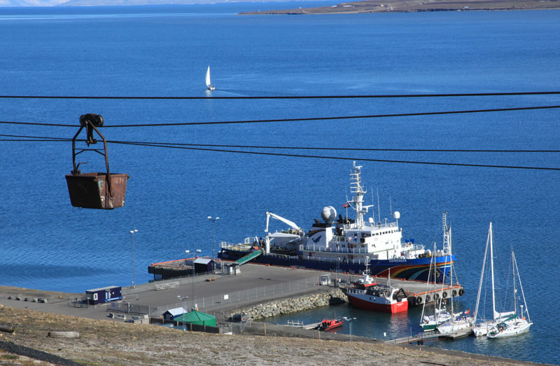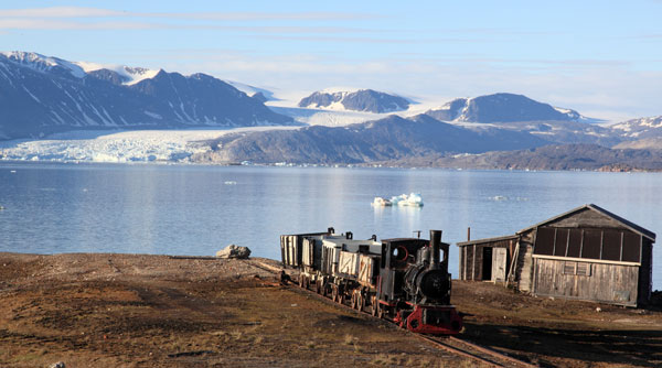 Bientôt des bâtiments tout en couleurs se détachent sur la côte : Ny Ålesund. Il y a un tout petit port avec un quai et un ponton pas très grand mais libre. Accostage et amarrage. Cela sera plus pratique pour aller visiter la ville. Située par 79° de latitude nord cette ville, autrefois ville minière fondée en 1916, est devenue une base scientifique internationale. 130 habitants l’été pour une trentaine pendant la période hivernale et autrefois elle en comptât jusqu’à 300 essentiellement des mineurs. Elle peut se considérer comme la ville habitée en permanence la plus septentrionale du monde. La dernière mine de charbon ferma en 1963 lorsqu’une ultime explosion provoqua la mort de 21 mineurs. Dans un musée ouvert au voyageur de passage et gratuit, une réplique d’une habitation de l’époque des mineurs, avec mobilier, ustensiles de cuisine, tenues vestimentaires, rend compte de la vie dure et âpre que menait les résidents. Epinglées aux murs de cette demeure reconstituée, des photos jaunies montrent une vie sociale bien organisée : des scènes de fêtes, des réunions, des familles avec enfants en bas-âges partageant un goûter d’anniversaire. Il ne reste rien de ces années d’exploitation houillère si ce n’est, sur un tronçon de voie ferrée, une locomotive à vapeur et ses wagons de bois qui transportaient le charbon extrait des mines vers le port. La reconversion s’est faite vers une recherche scientifique de pointe (météorologie, ornithologie, biologie marine, pollution, glaciologie, etc.). Des chercheurs d'une quinzaine de nationalité sont présents, dont des chinois et des hindous. Un kilomètre et demi d’un parcours balisé permet de se déplacer dans cette petite cité. Une renarde arctique accompagnée de deux renardeaux se déplace, insouciante, entre et sous les maisons de bois aux couleurs vives. De nombreuses oies bernaches en couple surveillent leurs oisillons qui n’arrêtent pas de picorer le sol. Les sternes arctiques sont innombrables et nidifient à même le sol. Agressives dès que l’on s’approche trop près de leurs nids dans lesquels un à deux œufs sont couvés ou un à deux oisillons piaillent si les œufs ont déjà éclos. Elles attaquent en piqué, bec en avant, vers le sommet du crâne de l’inopportun qui n’a d’autre solution que de s’éloigner au plus vite du nid. Des rennes en pleine mue s’amusent du spectacle, ruminant un pauvre lichen. Un peu plus loin, un pylône hideux défigure ce site, certainement l’un des plus beaux au monde. Ce pylône a une histoire : c’est le mât d’amarrage du dirigeable Norge. Amundsen et Nobile partirent de Ny Ålesund dans leur dirigeable et passèrent au-dessus du pôle nord avant d’atterrir en Alaska, nous étions en 1926.
