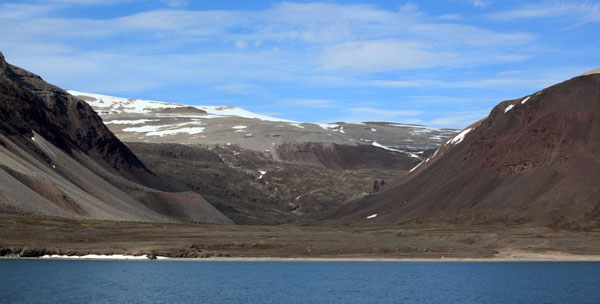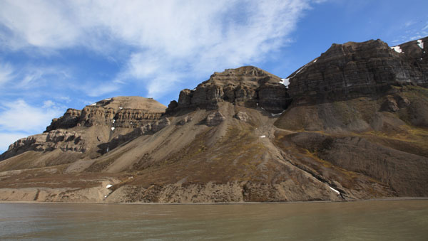 La visite de Longyearbyen achevé, par un ciel dégagé et une ambiance d’été, qu’il est agréable de remonter Advenfjord voiles établies hautes puis trois milles plus loin à virer au nord–est et embouquer Sassenfjord toujours par petite brise dans une lumière bleutée liée aux nombreux glaciers qui bordent le fjord. Templefjord est laissé à tribord. A l’entrée de Billefjord sur bâbord une petite baie se dessine : Skansbukta. Ce sera l’escale de la nuit! Disons du jour. Petite baie à l’ouest du Cap Fleur de Lys, circonscrite par une ligne de montagnes aux sommets aplatis par l’érosion, aux flancs burinés de strates entaillées profondément dans la roche et aux bases pyramidales. Mouillage par 5 à 6 mètres de fond de vase. Sur la plage un groupe de trekkeurs s’active pour installer leur bivouac dans ce cadre absolument désertique. Le mouillage va se révéler être rouleur, une petite houle régulière fait dandiner Noème au bout de sa chaîne. Quelques heures plus tard un Hurtigruten vient mouiller dans cette minuscule baie qu’il remplit de sa masse. La foule des passagers s’agglutine au bastingage, le temps de quelques photos et bien vite retourne à l’abri des baies de la cabine.