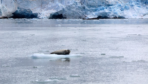 Avance au moteur, pas une ride sur l’eau. Peu de glaces dérivantes et toujours autant d’oiseaux. A la sortie de Forlandsund, la baie du Roi se présente par une large ouverture sur tribord. Dans une lumière limpide le spectacle est époustouflant, majestueux. De nombreux glaciers déversent leur trop-plein de glace, des champs de verdure disséminés dans les étendues rocailleuses cassent la monotonie des couleurs pierreuses. Et toujours autant de fulmars, macareux, sternes arctiques, mouettes tridactyles. De temps en temps émergent à la surface des têtes de phoques toutes rondes qui tel un périscope, balaient l'horizon.