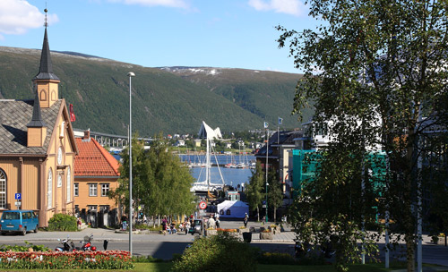 Tromsø, c’est la grande ville du nord avec ses 65000 habitants. Surnommée parfois la porte de l’Arctique ; nombreuses furent les expéditions à destination du pôle nord qui partirent de son port et continuent d’en partir de nos jours. Le site fut occupé dès le XIII siècle date à laquelle la cité obtint le statut de municipalité. La ville, cosmopolite, vivant aux rythmes des manifestations culturelles détient l’université, la cathédrale et le jardin botanique les plus septentrionaux au monde. Le centre de la ville établi sur l’île de Tromsøya est particulièrement animé avec ses musiciens, marchands ambulants, les clients des pubs disséminés dans toutes les rues, et il est raccordé par deux grands ponts à ses faubourgs. Le premier relie le centre-ville aux quartiers de Tromsdalen sur le continent et le second permet de rejoindre la banlieue située sur l’île de Kvaløya.