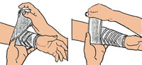 Le matériel utilisé : tissu adhésif, résilles élastiques ou bandages tubulaires, très pratiques pour immobiliser un pansement sur n’importe quelle région du corps. Existent en plusieurs diamètres, adaptés à chaque région du corps.