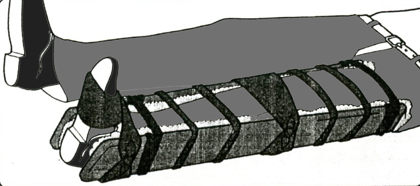 Bloquer le bassin par deux attelles latérales, maintenir par des sangles larges. Pas de sangles au niveau du bassin.