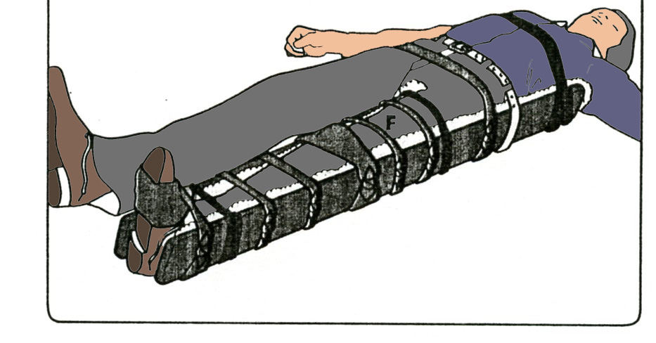 Toute suspicion de fracture de cuisse nécessite un blocage tronc-hanche-genou-cheville. Immobiliser avant de déplacer le blessé. Faire glisser 6 liens sous le membre inférieur dont trois au niveau de la cuisse et trois au niveau de la jambe. Un au niveau du bassin et un au niveau du tronc. Ne jamais disposer de lien au niveau de l’abdomen. Laisser la victime allongée sur le dos en la bloquant pour éviter tout glissement.