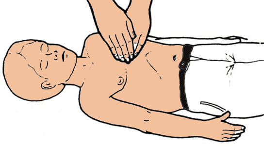 - l’appui sera médian. Enfoncer brusquement et fortement le sternum. Assurer une fréquence de 60 à 80 compressions par minute. Les mains restent en place entre chaque mouvement. Le sternum doit s’enfoncer de 4 cm environ pour être efficace. La ventilation assistée débute dans le même temps. En effet un cœur bien massé mais non oxygéné ne repartira pas.