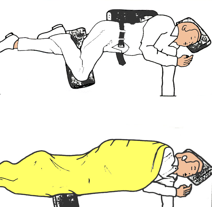 - Saisir le membre inférieur qui se retrouve dessus, le fléchir et amener le genou au contact du sol, ce qui à pour effet de bloquer le sujet et d’empêcher qu’il ne se retourne.