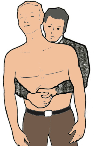 · La victime peut se tenir debout : l’opérateur se place derrière la victime, passe les bras en ceinture au niveau de l’abdomen sous les bras de la victime, un poing au creux de l’estomac, la deuxième main sur la première, les avants bras appuyés sur les dernières côtes du sujet. On enfonce brusquement en associant un mouvement des mains et des avant-bras de bas en haut.