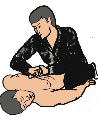 · Chez l’enfant on place 1, 2 ou 3 doigts (selon la taille de celui-ci) de chaque main, les uns sur les autres à la moitié inférieure du sternum. Chez le bébé on utilisera les pouces, les autres doigts enserrant la cage thoracique. La fréquence des percussions sera de 80 à 100 mouvements par minutes associée à une ventilation assistée type bouche-à-bouche-nez.