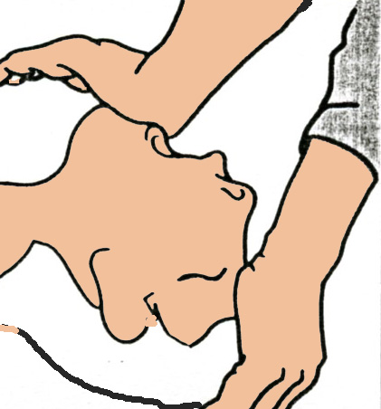 · Maintenir la tête fléchie en arrière en continuant à appuyer sur le front avec douceur. La main sous la nuque glisse vers le menton pour ouvrir la bouche.