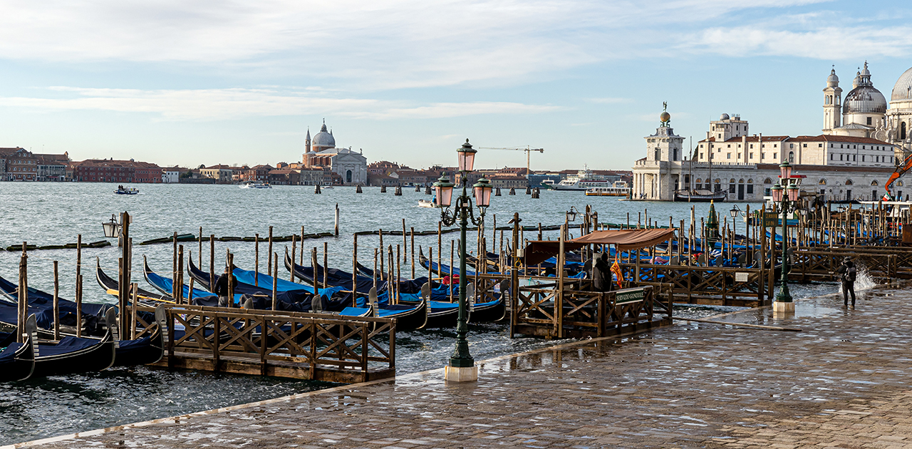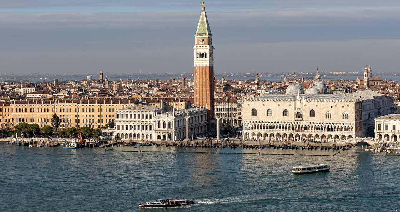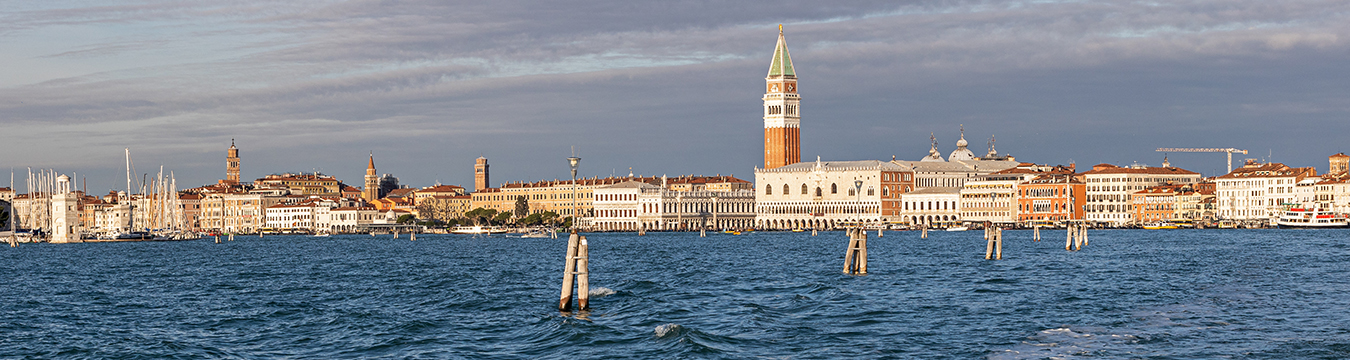 Venise c'est cent dix-huit îles et îlots, un labirynthe de ruelles tortueuses sans fin à sillonner à pied, quatre cent-trente-cinq ponts enjambant cent soixante canaux, des places, des édifices religieux dont la basilique Saint-Marc est le joyau de la ville, le palais ducal chef-d'oeuvre de l'art gothique, les admirables façades des palais bordant le grand canal sans oublier tous ces autres palais disseminés au coeur de la cité le long de canaux et de places. Des barques noires à l'étrave et à la poupe relevées, à l'air penché, menées par un long aviron sous l'effort d'un rameur vêtu de noir ou de rayures rouges, la tête recouverte d'un canotier à large bord bordé d'un ruban flottant au vent, parcourent sans répit le dédale des canaux, ce sont les gondoles et les gondoliers, image éternelle de Venise.