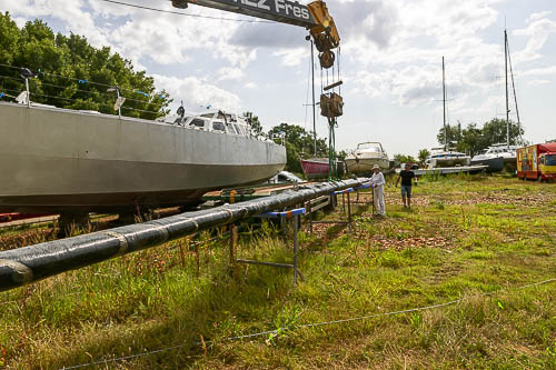 La mise en place du lest a été un peu longue car pour avoir la meilleure concentration de ce lest, dans le volume imparti, il a été necessaire de fabriquer de nombreux moules pour obtenir la bonne taille des lingots de plomb à installer dans le fond de la coque. Des lingots tout en longueur enrobés d'une enveloppe de tissu de verre résiné dans un deuxième temps à glisser sous les lisses pour éviter tout contact entre le plomb et l'aluminium de la coque. Des lingots de toutes tailles pour les adapter aux espaces à remplir, le tout pour quelques tonnes. Avant d'installer les lingots, isoler la coque avec une stratification verre résine époxy. Une fois tout ces lingots en place, les noyer et les bloquer avec de la résine de calage avant de stratifier l'ensemble à la structure. Ne pas oublier la réservation dans le lest au niveau de l'axe de la dérive pour pouvoir le retirer en cas de soucis au niveau de cette dernière.