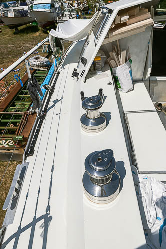 Une porte de descente à double battant en sandwich airex, cp, verre époxy. Début de la pose de l'accastillage, ici les winchs.