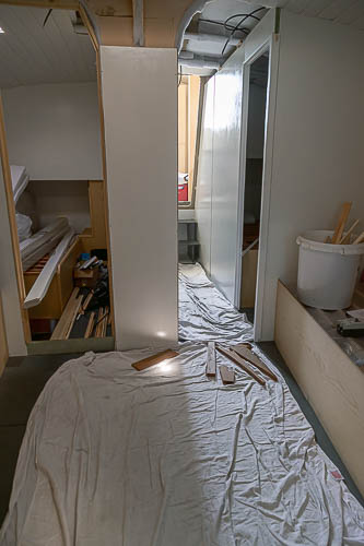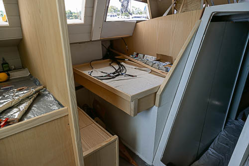 Mise en place des cloisons sandwich mousse verre époxy, des planchers en sandwich eux aussi. Aménagement du coin toilette, du coin douche, du carré avant et des couchettes