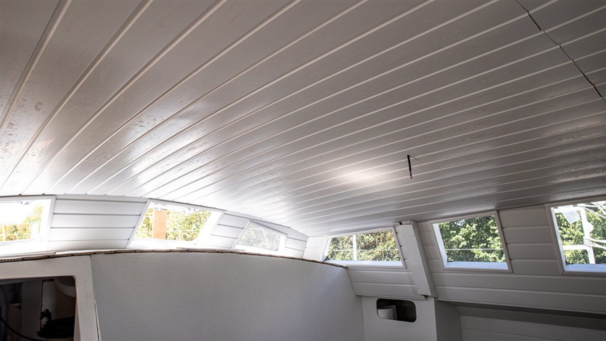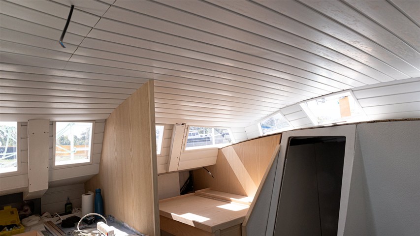 Pour gagner du poids les cloisons principales et certains meubles sont en sandwich verre-époxy avec mise en oeuvre sous vide. De même que pour les planchers. Les cloisons sont peintes en blanc avec une peinture polyuréthane bi-composante, les planchers sont peints en gris avec addition d'une poudre antidérapante,