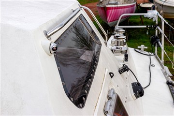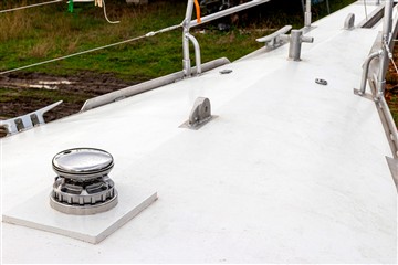 Le guindeau et la baille à mouillage. Le guindeau est un Quick Regal RG5 2300 m en 24 V. Baille à mouillage en stratifié boulonnée à la structure de la coque avec une pompe pour évacuer l'eau (mouillage et rinçage). Chaîne de 12 mm et ancre Rocna de 40 kg.