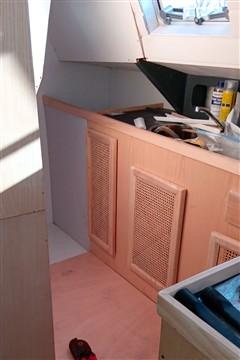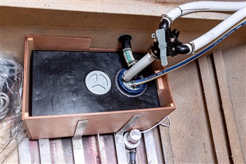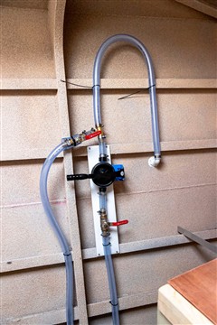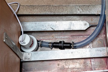 La trappe de visite du compartiment avant qui sert de crash box est étanche. Pompe de rinçage de la baille dont la sortie est couplée à l'évacuation de la pompe de cale électrique munie d'une valve anti-retour. Il y a aussi une pompe manuelle pour l'évacuation du réservoir à eaux noires, ce dernièr est muni d'une vanne trois voies pour vidange sur le pont.