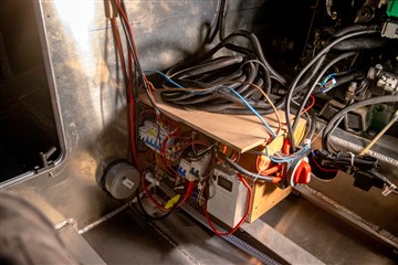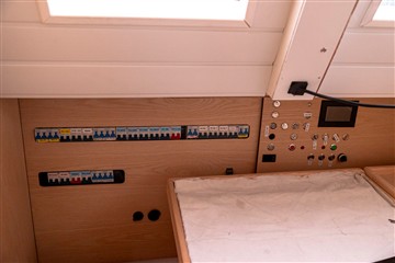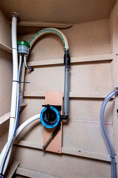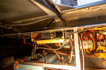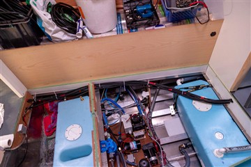 Réservoir à eaux grises et sa pompe d'évacuation. Dessalinisateur 30l/h et son réservoir dédié. Pompe du circuit d'eau. Chauffe-eau 220v et/ou circuit du chauffage à eau.