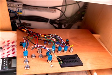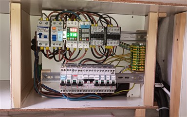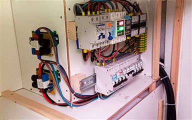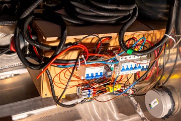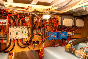 Le circuit électrique avec les MPPT pour les 4 panneaux solaires de 140 W montés en série deux par deux, onduleur de 5000kW, hydrogénérateur Watt and Sea 300W, chargeur 24V, 2 alternateurs 24V, chargeur 12-24V à partir des batteries moteur.